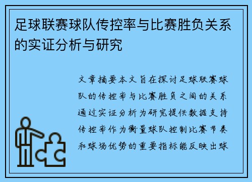 在现代足球分析中,控球率被广泛用作衡量球队实力与比赛掌控能力的重要指标。然而,高控球率是否直接等同于高胜率,一直是学术界和职业分析师关注的热点问题。本文将从数据分析、战术策略及实战案例等角度,深入研究控球率与胜率之间的关系,并探讨如何利用这一指标优化球队表现。